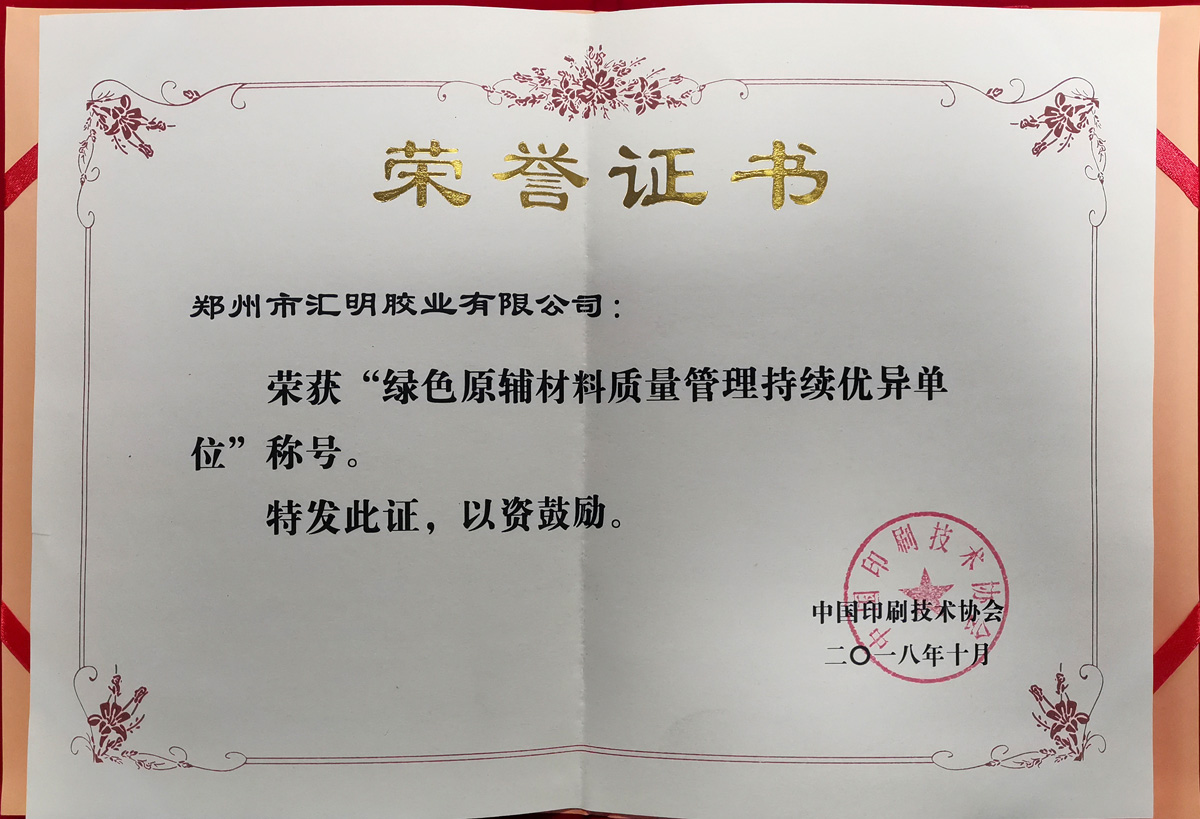 綠色原輔材料質量管理持續(xù)優(yōu)異單位榮譽證書